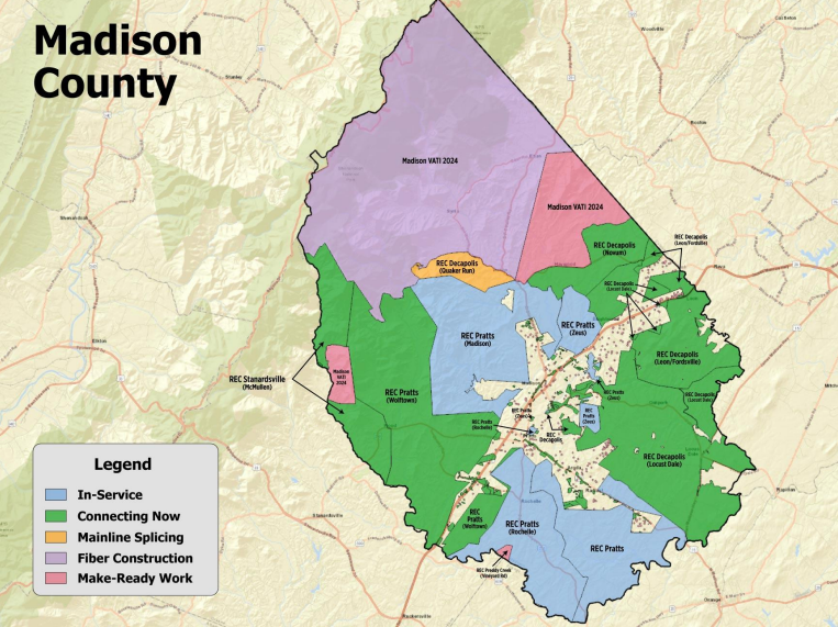Areas that were initially included in the VATI 2022 grant are either already connected or are in the process of being connected. This includes Wolftown, Madison, Zeus, Rochelle, Pratts, Locust Dale, Novum and Leon. Make-ready work, which is done by REC and consists of preparing and in some cases, installing, poles to hold the fiber is ongoing in the VATI 2024 areas, along with fiber construction. Contractors are working in Haywood, Etlan, Syria, Criglersville, and Kinderhook. Fiber splicing is ongoing in Quaker Run.