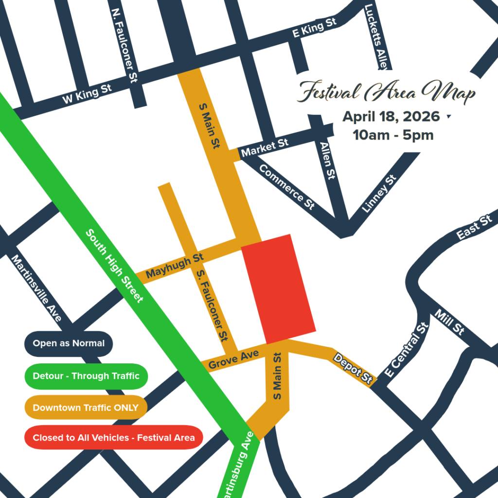 Main Street between Depot Street and Mayhugh Avenue will be closed to vehicles from 10 a.m. to 5 p.m. to create a pedestrian-only area. Through traffic will be detoured at High Street. Parking will be available along Main Street and at Preddy’s Funeral Home. The remaining roads in town will remain open to local traffic including festivalgoers, residents and visitors interested in shops, restaurants and other attractions.