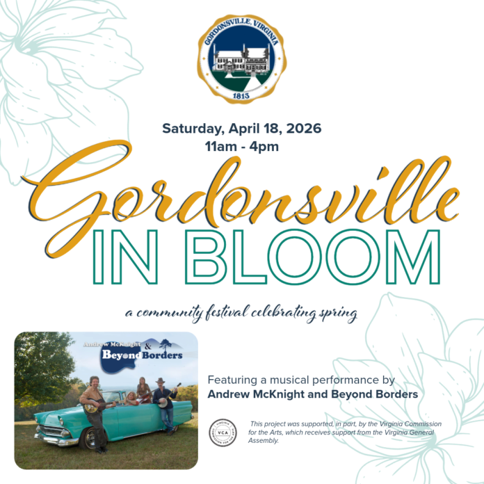 Gordonsville in Bloom will be held rain or shine Saturday, April 18, 11 a.m. to 4 p.m. For more information, visit https://www.townofgordonsville.org/events/gordonsville_in_bloom.php.