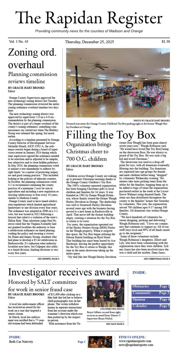 Gracie Hart Brookshttp://rapidanregister.comBorn and raised in Virginia, Gracie has nearly two decades of experience in community journalism covering county and town boards and commissions, education, business and more. She believes in the power and importance of telling local stories and resides with her husband, two daughters and Bernedoodle in a small town.