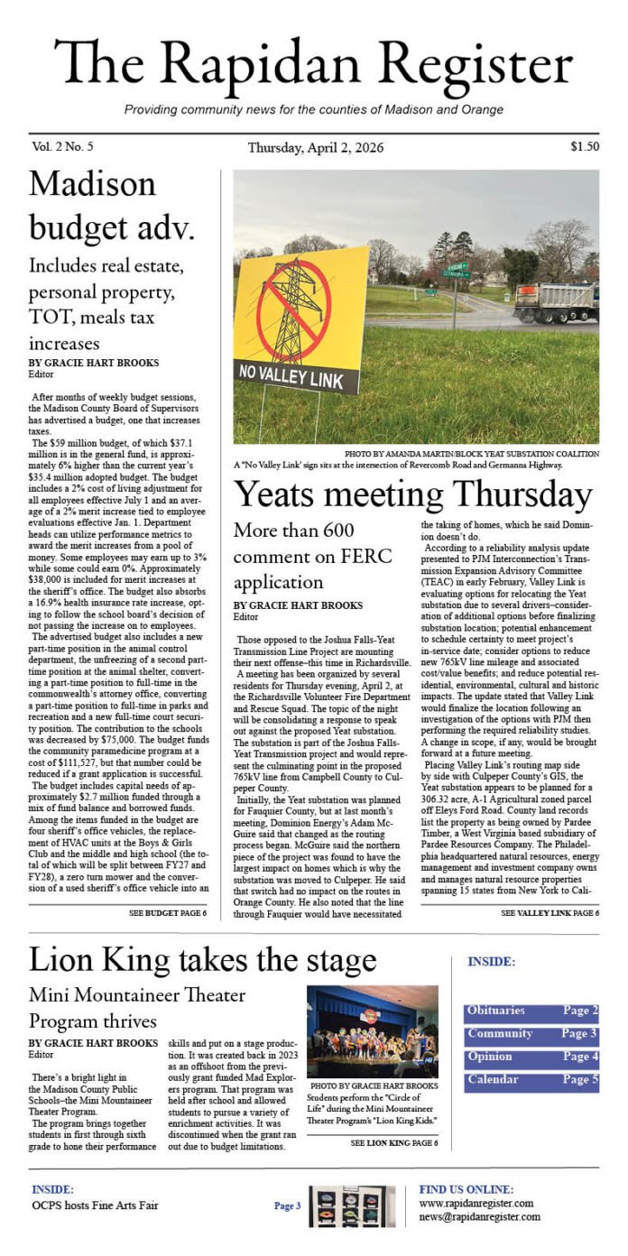 Gracie Hart Brookshttp://rapidanregister.comBorn and raised in Virginia, Gracie has nearly two decades of experience in community journalism covering county and town boards and commissions, education, business and more. She believes in the power and importance of telling local stories and resides with her husband, two daughters and Bernedoodle in a small town.