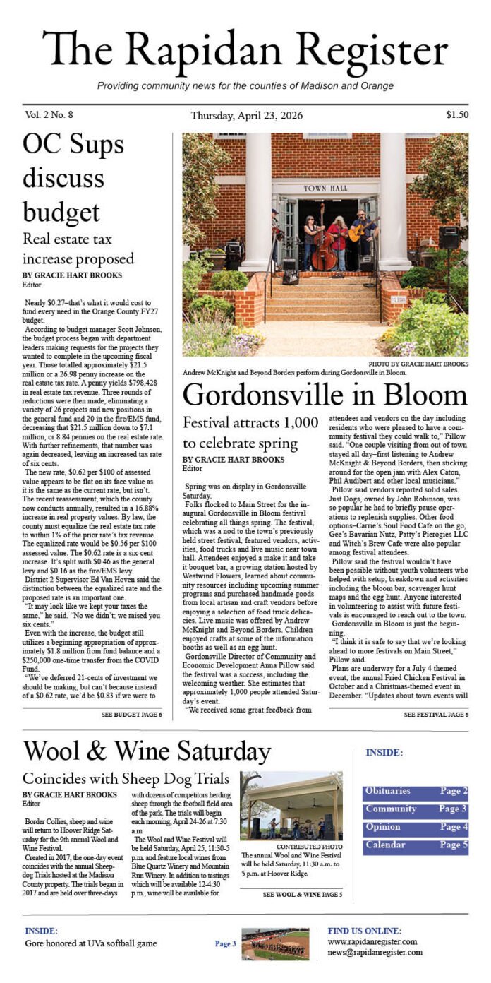 Gracie Hart Brookshttp://rapidanregister.comBorn and raised in Virginia, Gracie has nearly two decades of experience in community journalism covering county and town boards and commissions, education, business and more. She believes in the power and importance of telling local stories and resides with her husband, two daughters and Bernedoodle in a small town.