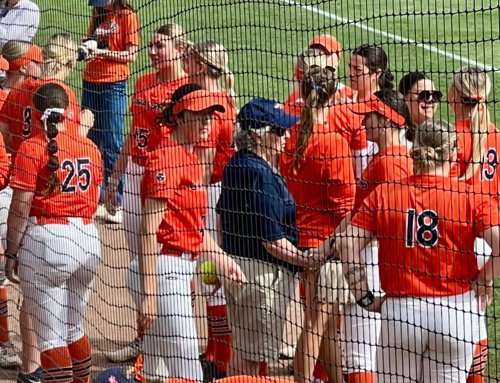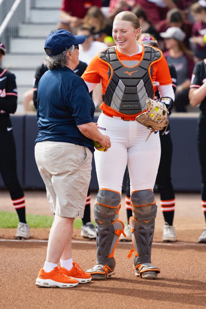 Gore was recognized for her longtime advocacy for women’s sports. “It was an honor to throw out the first pitch at the softball clash between UVA and Virginia Tech,” she said. “My family, especially my grandchildren, were full of questions and compliments afterward. My former players said they too felt honored. That in itself meant so much to me, for it was the young women and their talents and coachable attitudes that brought women in athletics to the forefront in our rural community.”