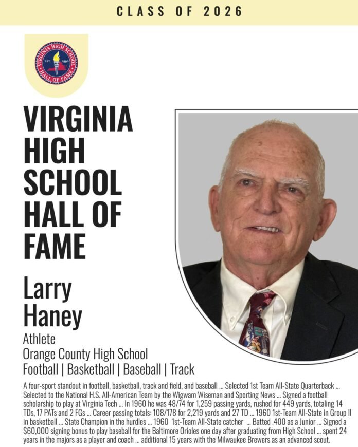 The 2026 class includes 11 inductees and are All-Americans, All-State athletes, state champions, coaches and contributors and a sports journalist. Among them is former Orange County High School Athlete Larry Haney. Haney was a four-sport athlete for the Hornets, playing football, basketball and baseball and participating in track. He was selected First Team All-State Quarterback and was named to the National High School All-American Team by the Wigwam Wiseman and Sporting News. In 1960, he was 48 for 74 for 1,259 passing yards with 449 rushing yards, 10 touchdowns, 17 PATs and two field goals. That same year he was First Team All-State in Group II in basketball, a state champion in the hurdles and First Team All-State Catcher. As a junior he batted .400. In football, his career passing totals was 108 for 178 for 2,219 yards and 27 touchdowns. He received a football scholarship to play at Virginia Tech, but opted to sign on to play for the Baltimore Orioles after graduating high school. He received a $60,000 signing bonus.