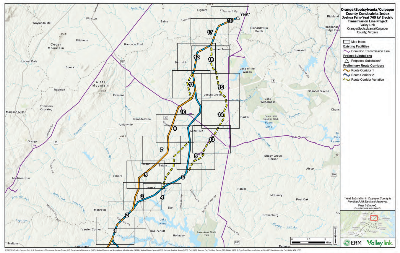 The project, one of three proposed by joint venture Valley Link and approved by regional transmission organization PJM Interconnection, would build approximately 115 miles of 765kV transmission lines from Campbell County to Culpeper County. Preliminary routes cross up to nine localities, including Orange County. At 765kV, the transmission lines are the highest voltage, highest capacity transmission line type available in the country and would include structures between 135 and 160 feet tall requiring approximately 200 feet of right-of-way.