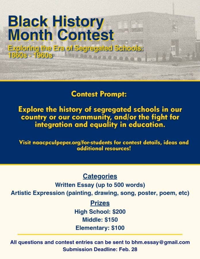 The NAACP Culpeper Branch and the Madison County African American Historical Association (MCAAHA) have announced their partnership in presenting the 2026 Black History Month student contest for the month of February. The contest will focus on the era of segregated schools and the fight for integration, and will feature two categories: Essays (up to 500 words) and Artistic Expression, to include poems, songs, paintings, drawings, and photographs.
