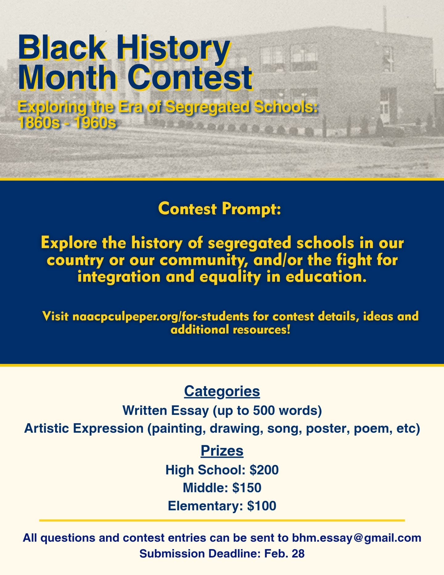 The contest prompt is: Explore the history of segregated schools in our country or our community, and/or the fight for integration and equality in education.
